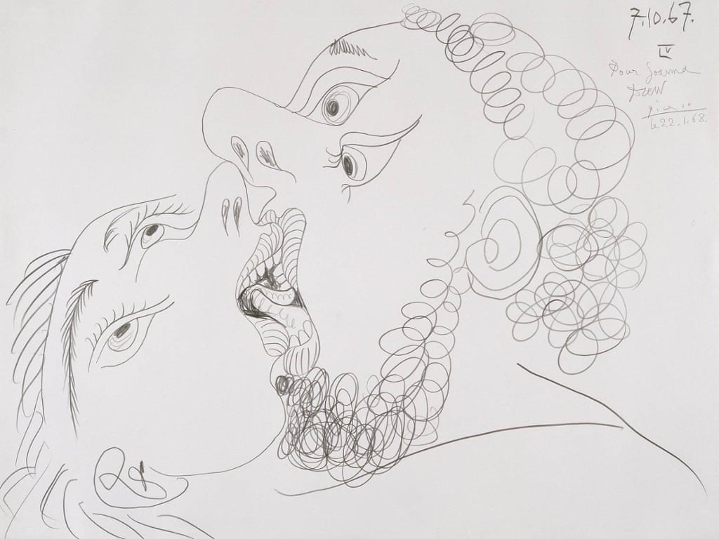 Όταν ο Πικάσο ζωγραφίζει ή σχεδιάζει ένα φιλί – και επέστρεψε ακόρεστα σε αυτό το θέμα – δεν πρόκειται για ένα αγνό ρομαντικό άγγιγμα χειλιών, αλλά για μια σαρκική συνάντηση γλωσσών. Η στοματική εμπλοκή σε αυτό το όψιμο έργο του πιο σεξουαλικού καλλιτέχνη είναι αδύνατο να παρεξηγηθεί. Σαφώς, δεν απεικονίζει τόσο ένα φιλί όσο μια εκστατική αλληγορία όλων των συνουσιών που μπορεί να θυμηθεί ή να φανταστεί.