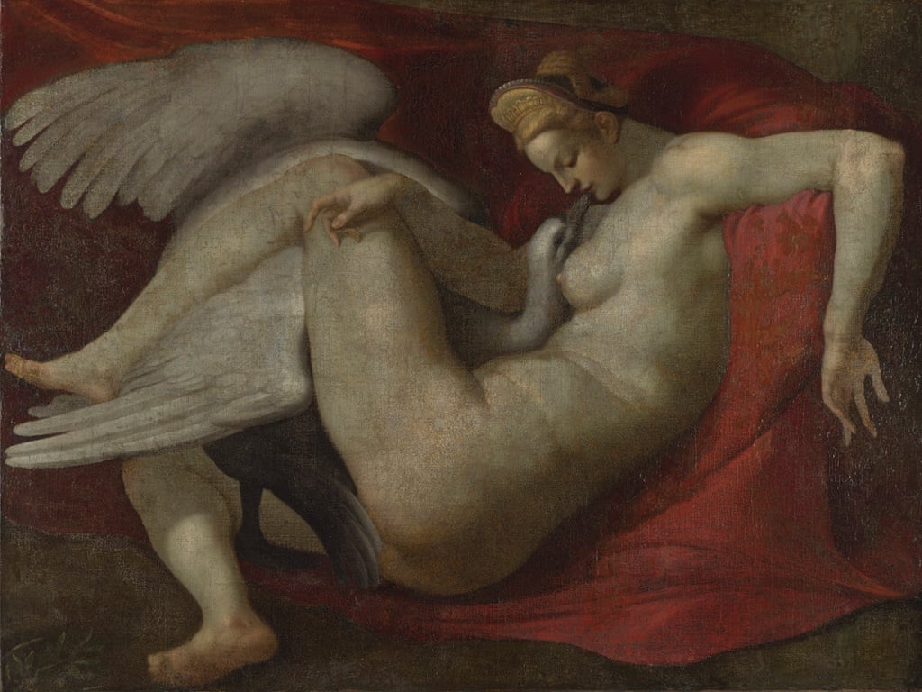 Υπάρχουν έντονες νύξεις ομοφυλοφιλίας καθώς και πεολειχίας σε αυτή την απεικόνιση της Λήδας που κάνει έρωτα με έναν κύκνο. Στον αρχαίο μύθο, ο Δίας πήρε τη μορφή κύκνου για να αποπλανήσει τη Λήδα. Τέτοιοι μύθοι μετατράπηκαν από καλλιτέχνες της Αναγέννησης όπως ο Τιτσιάνο σε σαγηνευτικούς αισθησιακούς πίνακες. Ο Μιχαήλ Άγγελος κάνει προκλητικά τη σχέση πραγματικότητα. Το μοντέλο για τη Λήδα ήταν ο βοηθός του, Αντόνιο Μίνι. Το έργο μόλις που κρύβει τη φαντασίωση του Μιχαήλ Άγγελου – ή την καταγραφή – του ίδιου του πέους να συναντά το στόμα της Μίνι.