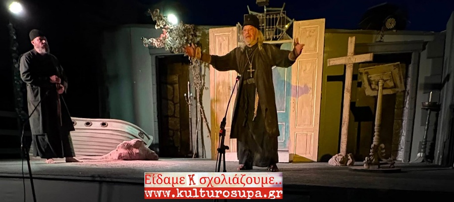Στην παράσταση που παρακολουθήσαμε, μάς εντυπωσίασε το κατανυκτικό άκρως ατμοσφαιρικό σκηνικό στο οποίο τόσο Ο Παύλος Βησσαρίου, που υποδύεται τον Κοσμά τον Αιτωλό, όσο κι ο Γιάννης Σταμούλης, που υποδύεται τον Καλόγερο που τον ακολουθεί βήμα- βήμα κι αφηγείται πολλές από τις στιγμές του βίου του Αγίου, δρουν για 65 λεπτά και μας μεταδίδουν όλο το πνεύμα και τις συνθήκες εκείνης της εποχής.