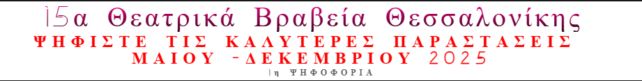 ΑΞΙΟΛΟΓΗΣΤΕ THN ΠΑΡΑΣΤΑΣΗ ΨΗΦΙΖΟΝΤΑΣ ΓΙΑ ΤΑ ΘΕΑΤΡΙΚΑ ΒΡΑΒΕΙΑ ΚΟΙΝΟΥ ΣΤΗ ΘΕΑΤΡΙΚΗ ΚΑΛΠΗ ΤΗΣ «Κ» ΠΟΥ ΘΑ ΒΡΕΙΤΕ ΣΤΗΝ ΕΙΣΟΔΟ ΤΟΥ ΘΕΑΤΡΟΥ. ΑΝ ΟΧΙ, ΨΗΦΙΣΤΕ ΑΡΓΟΤΕΡΑ ΣΕ ΑΛΛΟΥΣ 13 ΧΩΡΟΥΣ ΤΗΣ ΘΕΣΣΑΛΟΝΙΚΗΣ αρκεί ΝΑ ΜΗ ΠΕΤΑΞΕΤΕ ΤΑ ΕΙΣΙΤΗΡΙΑ ΣΑΣ, δείτε που τι και πως… κλικ στο banner….
