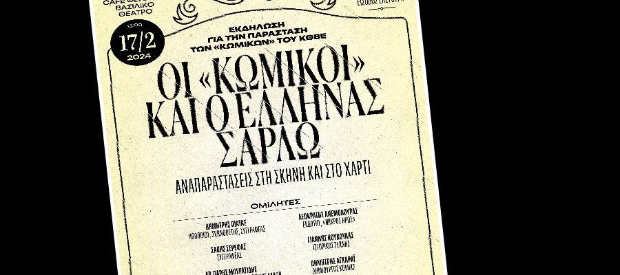 Με αφορμή τη μεγάλη απήχηση που έχει ήδη από τις πρώτες μέρες της παρουσίασής της η νέα παραγωγή του ΚΘΒΕ «Οι κωμικοί» των Δημήτρη Πιατά και Σάκη Σερέφα, σε σκηνοθεσία Δημήτρη Πιατά, θα πραγματοποιηθεί εκδήλωση με τίτλο «Οι Κωμικοί και ο Έλληνας Σαρλώ: αναπαραστάσεις στη σκηνή και στο χαρτί», το Σάββατο 17 Φεβρουαρίου στις 12.00 στο Café θέα/troστο Βασιλικό Θέατρο.