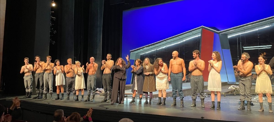 Η Νικαίτη Κοντούρη (σκηνοθέτης της παράστασης) μαζί με τους ηθοποιούς στην υπόκλιση, μετά το τέλος της παράστασης.